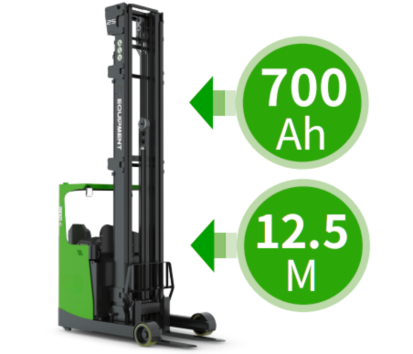 CQD25RV(F) มาพร้อมแบตเตอรี่ตะกั่วกรด 48V/700Ah อายุการใช้งานยาวนานเป็นมาตรฐาน ซึ่งช่วยให้รถสามารถทำงานหนักในคลังสินค้าได้ในชั่วโมงการทำงานที่ยาวนาน CQD25RV(F) มีความสูงในการยกสูงถึง 12.5 เมตรเพื่อตอบสนองระบบชั้นวางคลังสินค้าที่หลากหลาย