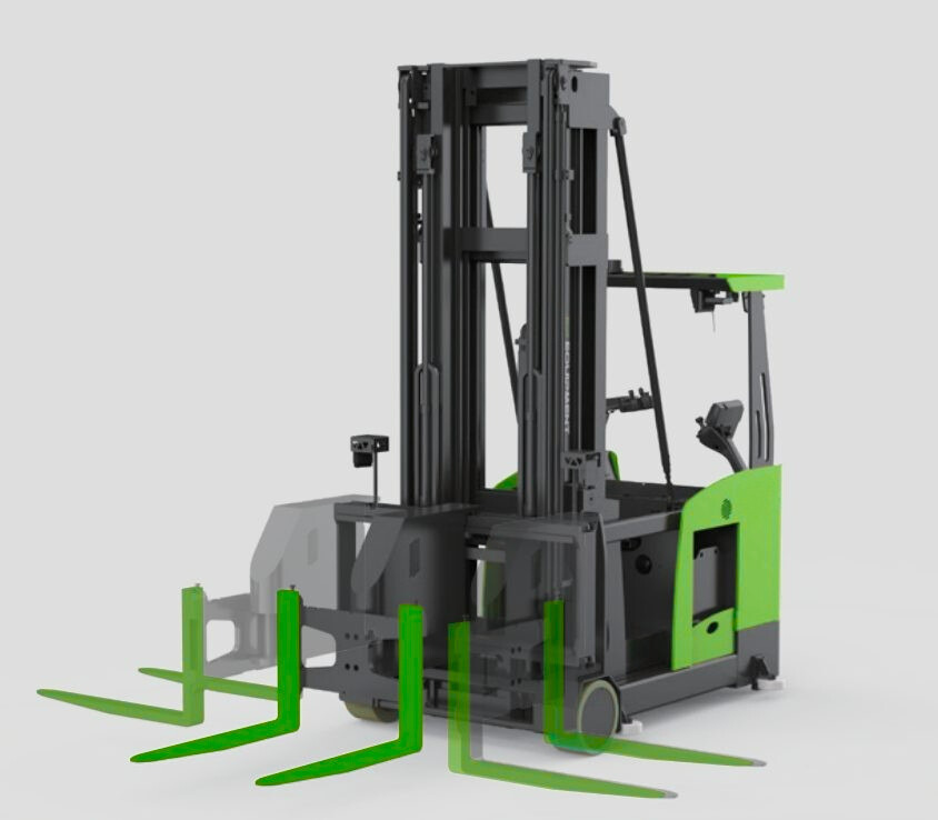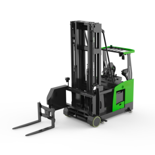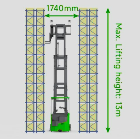 • ความต้องการความกว้างทางเดินเพียง 1740 มม. ช่วยเพิ่มการใช้พื้นที่ให้มากที่สุด และหัวทำงานแบบสามทิศทางพร้อมอุปกรณ์เลื่อนด้านข้างให้ความสามารถในการจัดการแบบหลายทิศทาง 180° ทั้งสองด้านของทางเดินขณะเคลื่อนที่ตรง ข้อได้เปรียบทั้งสองนี้ช่วยให้สามารถติดตั้งชั้นวางสินค้าได้มากขึ้นในพื้นที่พื้นเท่ากันเมื่อเทียบกับรถโฟล์คลิฟท์แบบดั้งเดิม